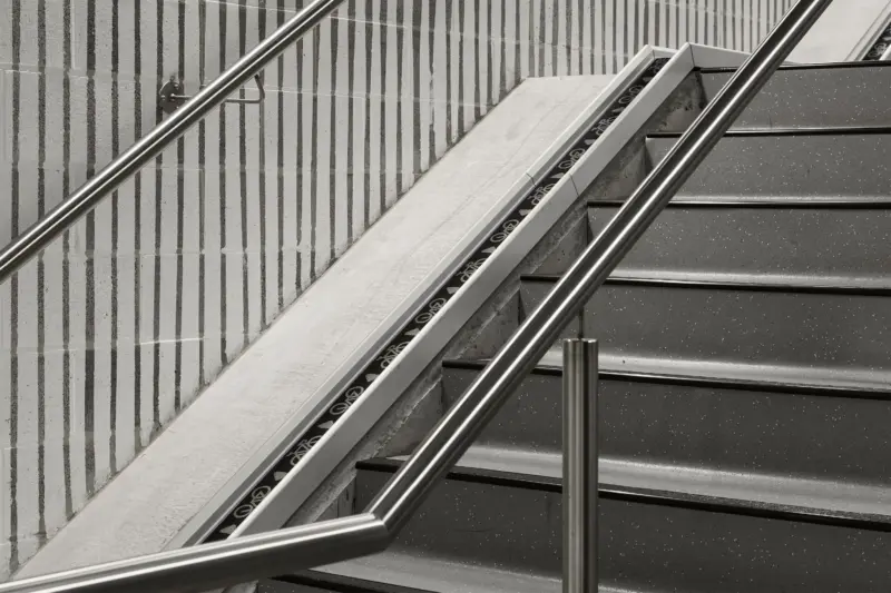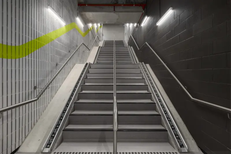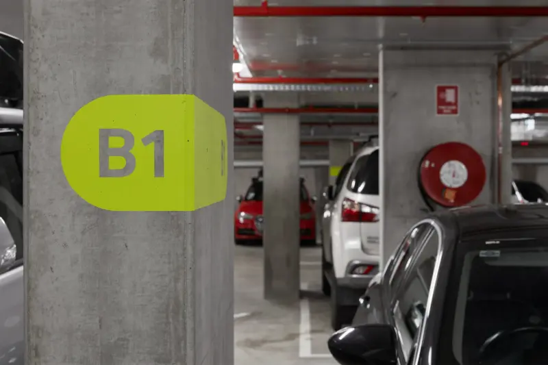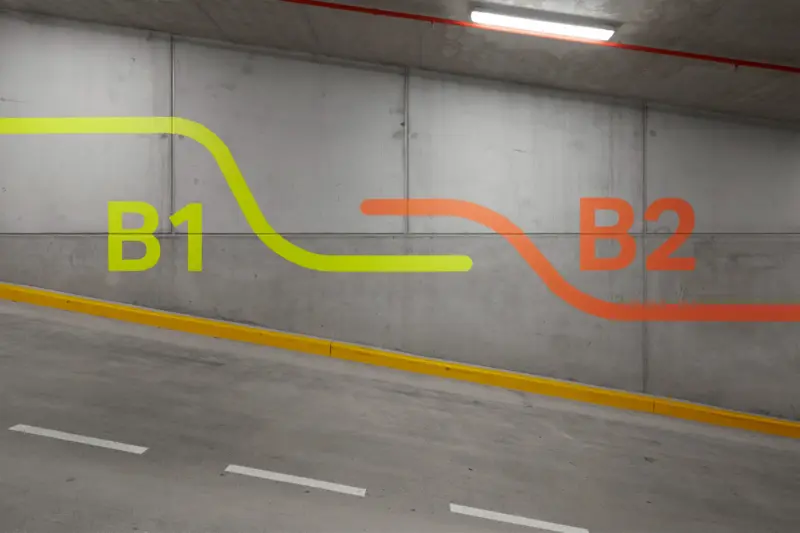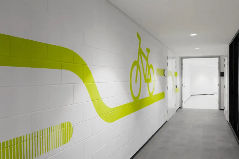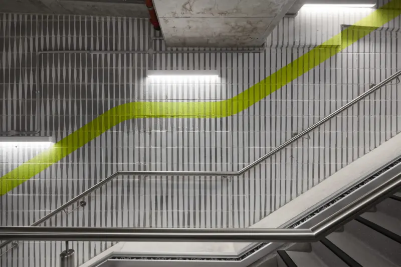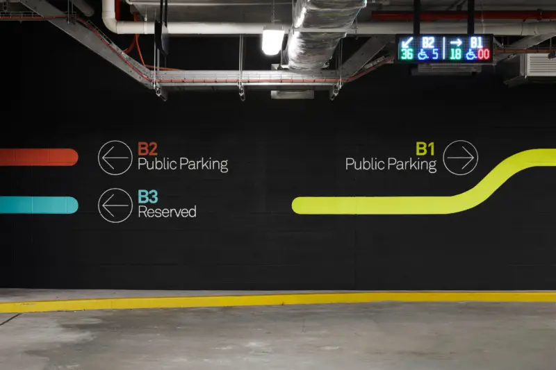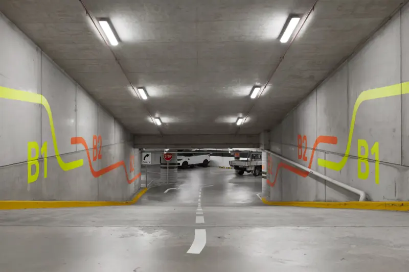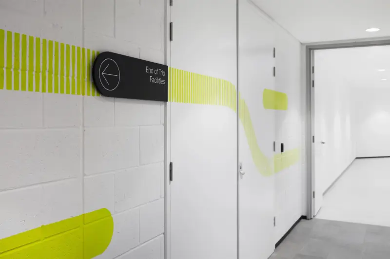 The basement carpark experience is enlivened with a series of bright graphic treatments painted directly to the raw concrete surfaces, leading visitors down to the employee end-of-trip experience facilities and beyond.