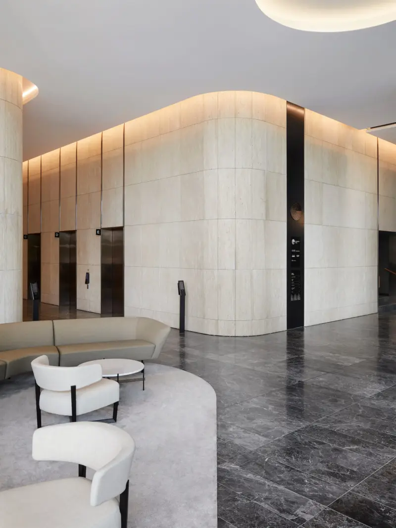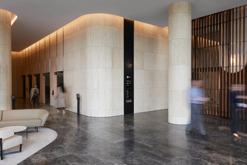 In response to Bates Smart’s sophisticated architecture, the commercial interiors feature thoughtful signage pieces in aluminium and linished bronze that seamlessly blend with the internal aesthetic.