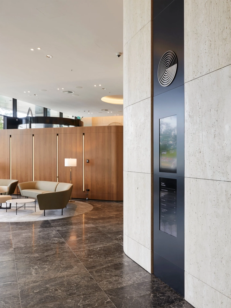 The wayfinding and signage system plays an essential, functional role in enhancing the visitor experience, guiding individuals efficiently through the layout of the building’s A-grade workplace. Locally manufactured and installed by Owens, the integration seamlessly blends with the architectural and interior aesthetics.