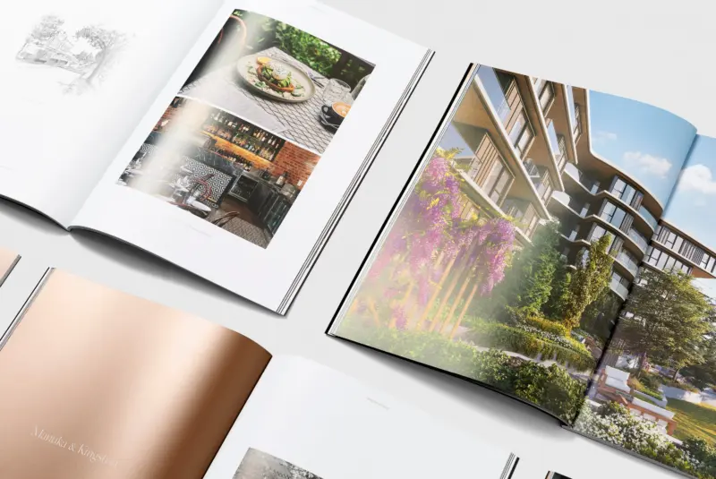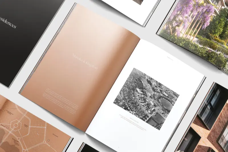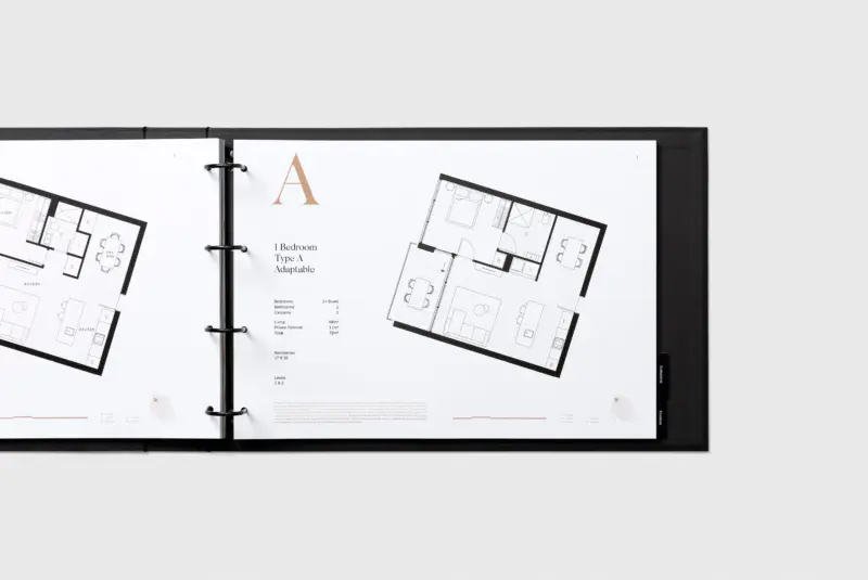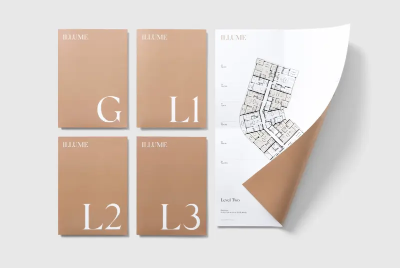 To support the marketing and sales efforts, Swell designed a comprehensive suite of print materials including custom-wrapped brochures featuring metallic inks and a foil-stamped logo, and large fold-up level plans to house floor plans and inclusions brochures.